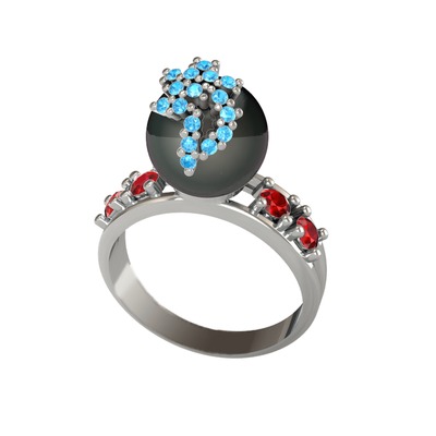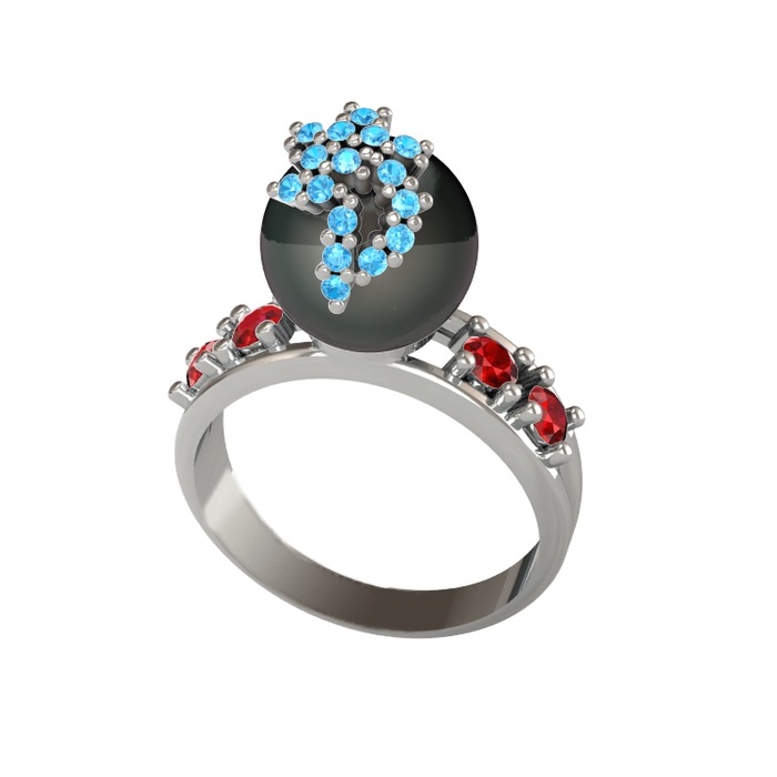 Siyah inci, akuamarin ve garnet 8 ayar beyaz altın yüzük