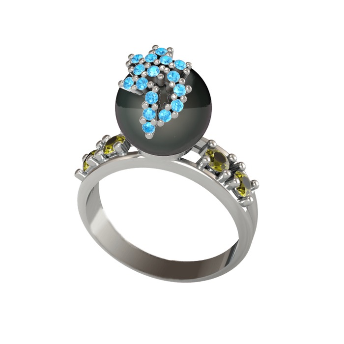 Siyah inci, akuamarin ve peridot 8 ayar beyaz altın yüzük