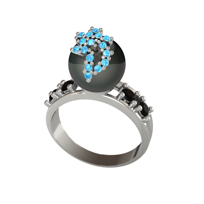 Siyah inci, akuamarin ve siyah zirkon 8 ayar beyaz altın yüzük