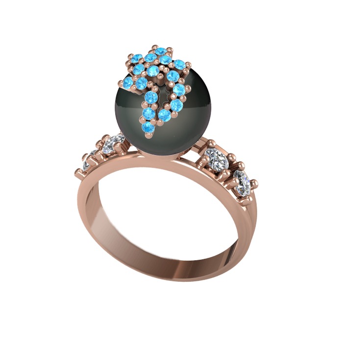Siyah inci, akuamarin ve swarovski 925 ayar rose altın kaplama gümüş yüzük