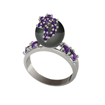Siyah inci ve ametist 14 ayar beyaz altın yüzük