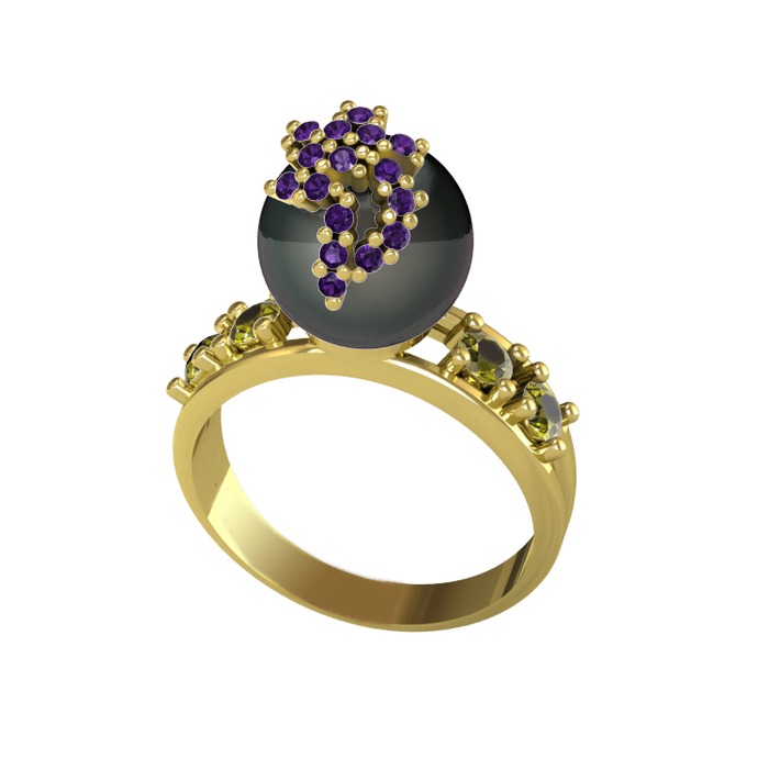 Siyah inci, ametist ve peridot 18 ayar altın yüzük