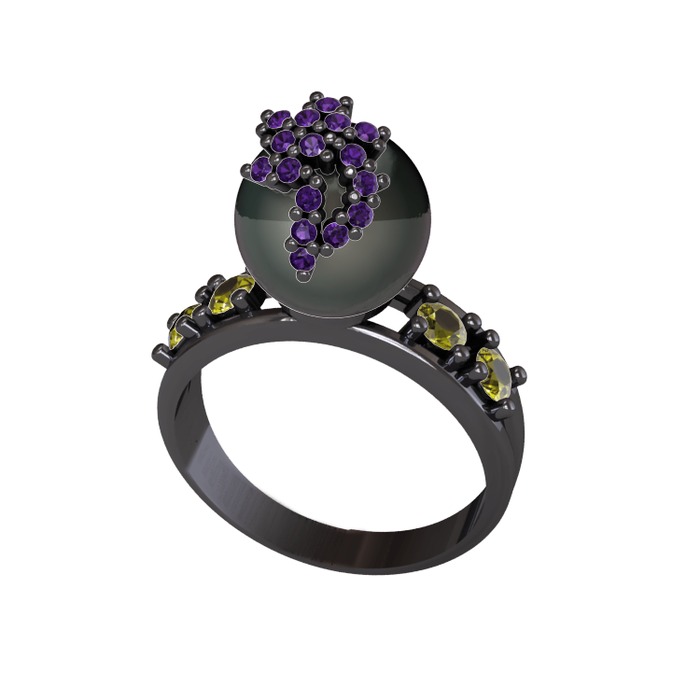 Siyah inci, ametist ve peridot 925 ayar siyah rodyum kaplama gümüş yüzük