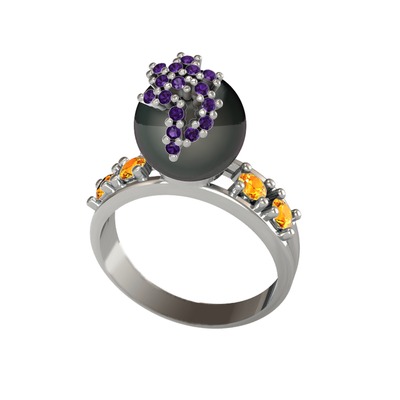Siyah inci, ametist ve sitrin 18 ayar beyaz altın yüzük