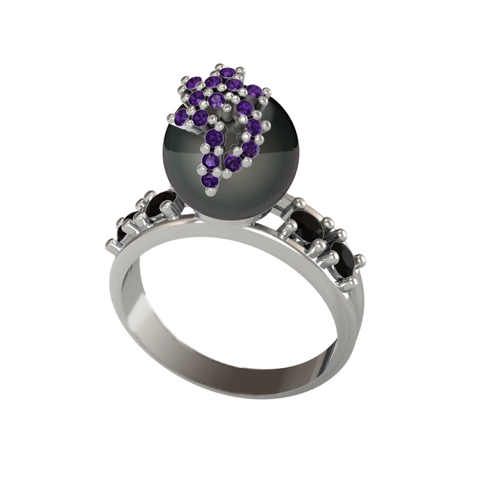 Siyah inci, ametist ve siyah zirkon 18 ayar beyaz altın yüzük