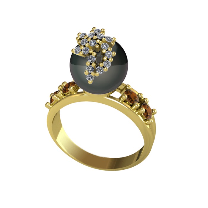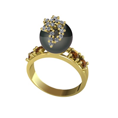 Siyah inci, beyaz zirkon ve dumanlı kuvars 14 ayar altın yüzük