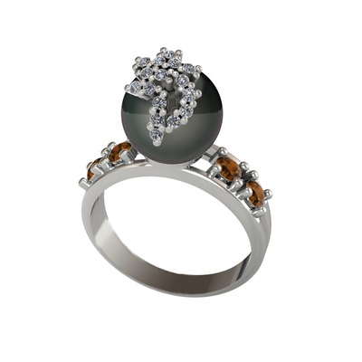 Siyah inci, beyaz zirkon ve dumanlı kuvars 14 ayar beyaz altın yüzük