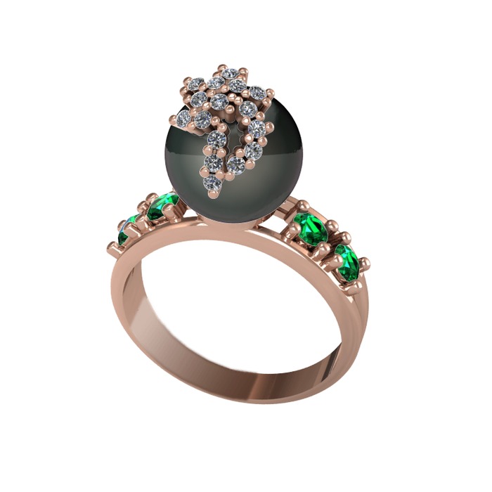 Siyah inci, beyaz zirkon ve yeşil kuvars 14 ayar rose altın yüzük