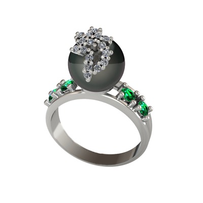 Siyah inci, beyaz zirkon ve yeşil kuvars 8 ayar beyaz altın yüzük