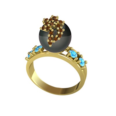 Siyah inci, dumanlı kuvars ve akuamarin 14 ayar altın yüzük