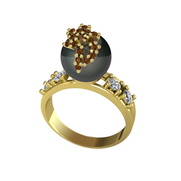 Siyah inci, dumanlı kuvars ve beyaz zirkon 8 ayar altın yüzük