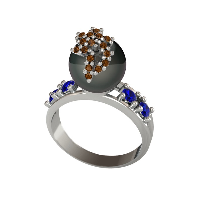 Siyah inci, dumanlı kuvars ve lab safir 8 ayar beyaz altın yüzük
