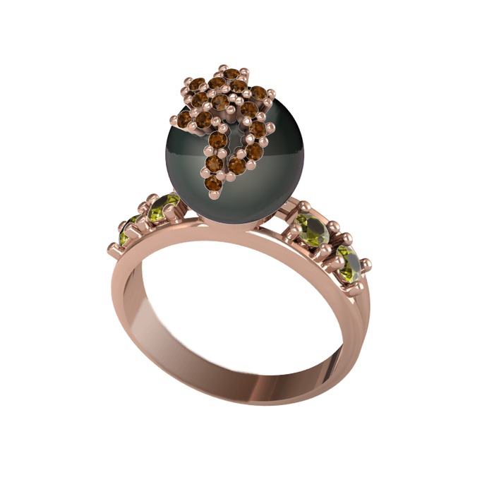 Siyah inci, dumanlı kuvars ve peridot 18 ayar rose altın yüzük