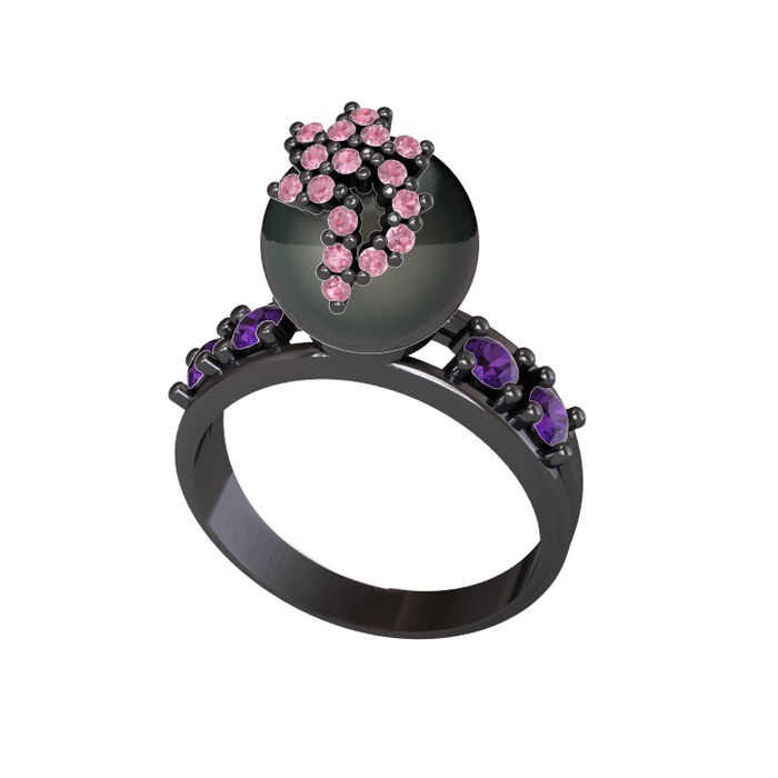 Siyah inci, pembe kuvars ve ametist 925 ayar siyah rodyum kaplama gümüş yüzük