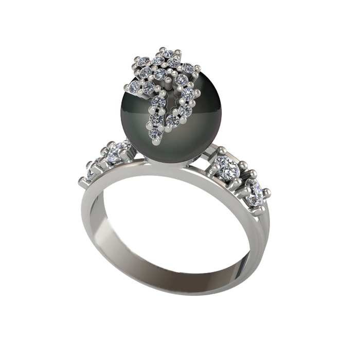 Siyah inci ve pırlanta 8 ayar beyaz altın yüzük (0.22 karat)