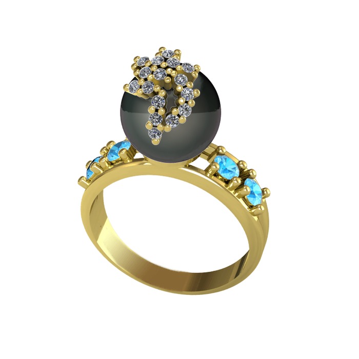 Siyah inci, pırlanta ve akuamarin 925 ayar altın kaplama gümüş yüzük (0.176 karat)