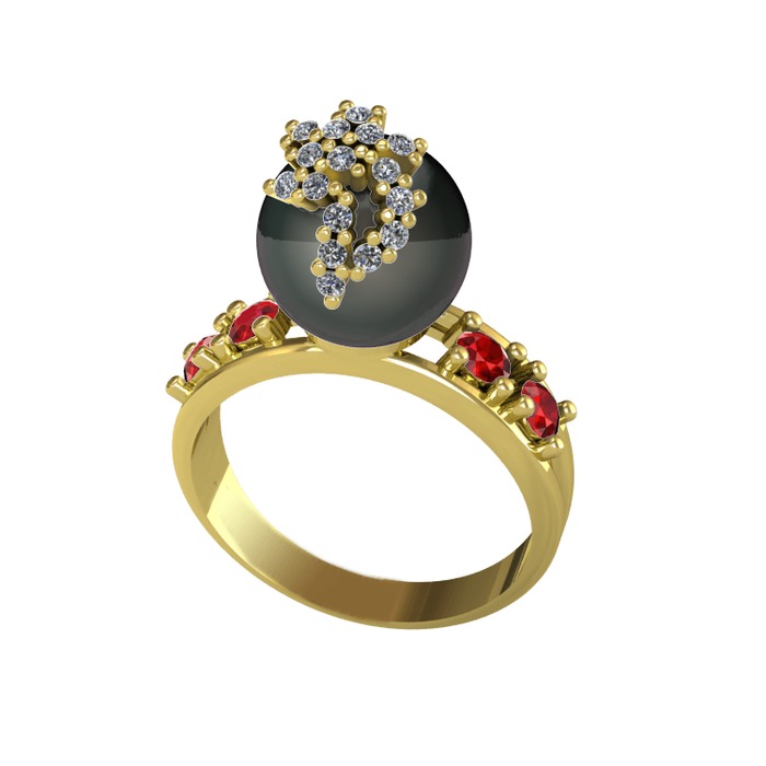 Siyah inci, pırlanta ve garnet 14 ayar altın yüzük (0.176 karat)