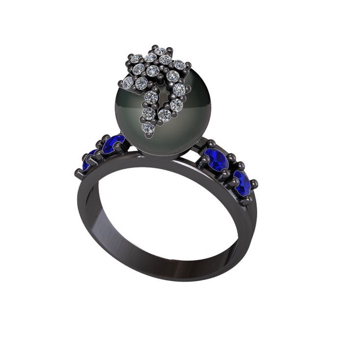 Siyah inci, pırlanta ve lab safir 925 ayar siyah rodyum kaplama gümüş yüzük (0.176 karat)