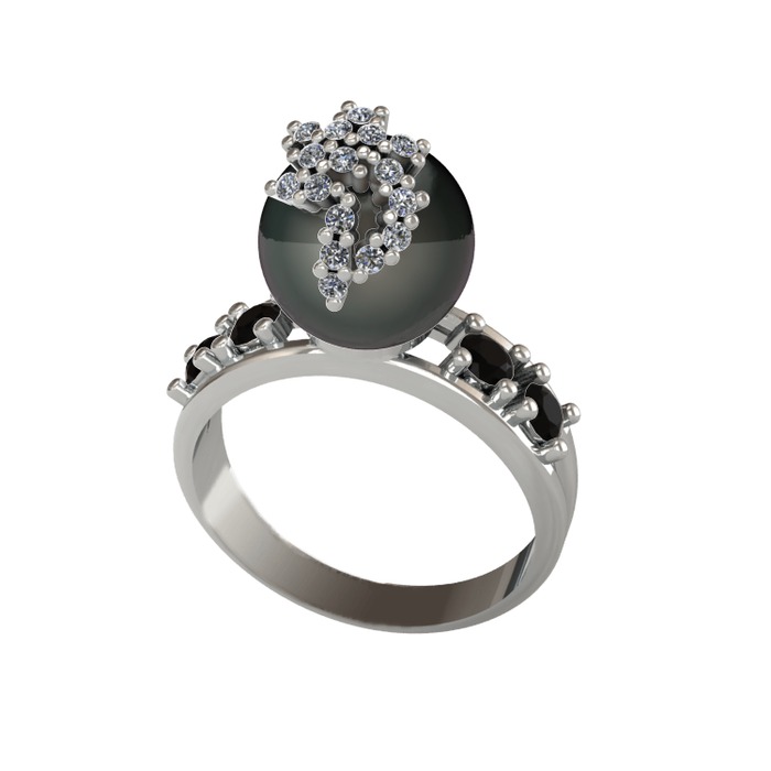 Siyah inci, pırlanta ve siyah zirkon 8 ayar beyaz altın yüzük (0.176 karat)