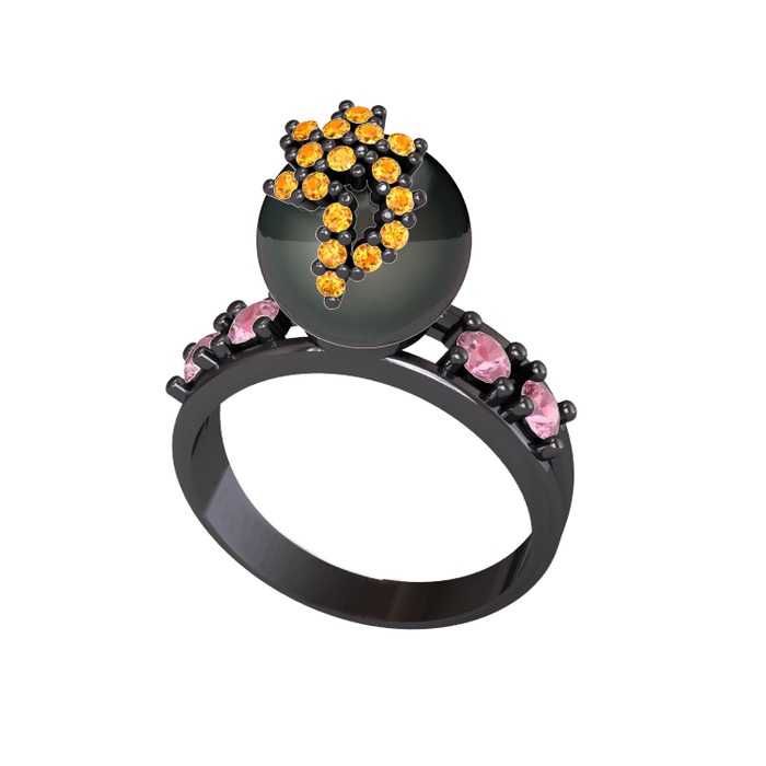 Siyah inci, sitrin ve pembe kuvars 925 ayar siyah rodyum kaplama gümüş yüzük
