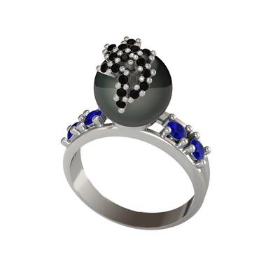 Siyah inci, siyah zirkon ve lab safir 8 ayar beyaz altın yüzük