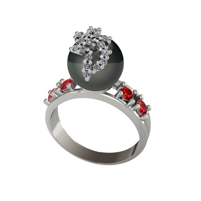 Siyah inci, swarovski ve garnet 14 ayar beyaz altın yüzük