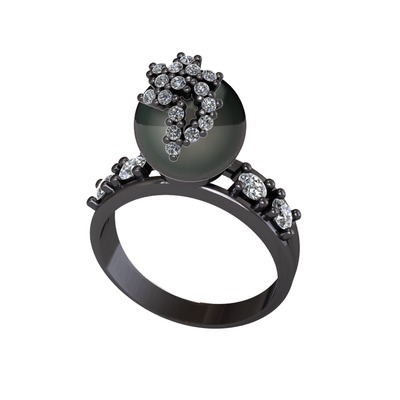 Siyah inci, swarovski ve pırlanta 925 ayar siyah rodyum kaplama gümüş yüzük (0.044 karat)