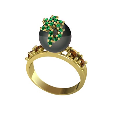 Siyah inci, yeşil kuvars ve dumanlı kuvars 14 ayar altın yüzük