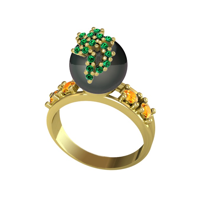 Siyah inci, yeşil kuvars ve sitrin 8 ayar altın yüzük