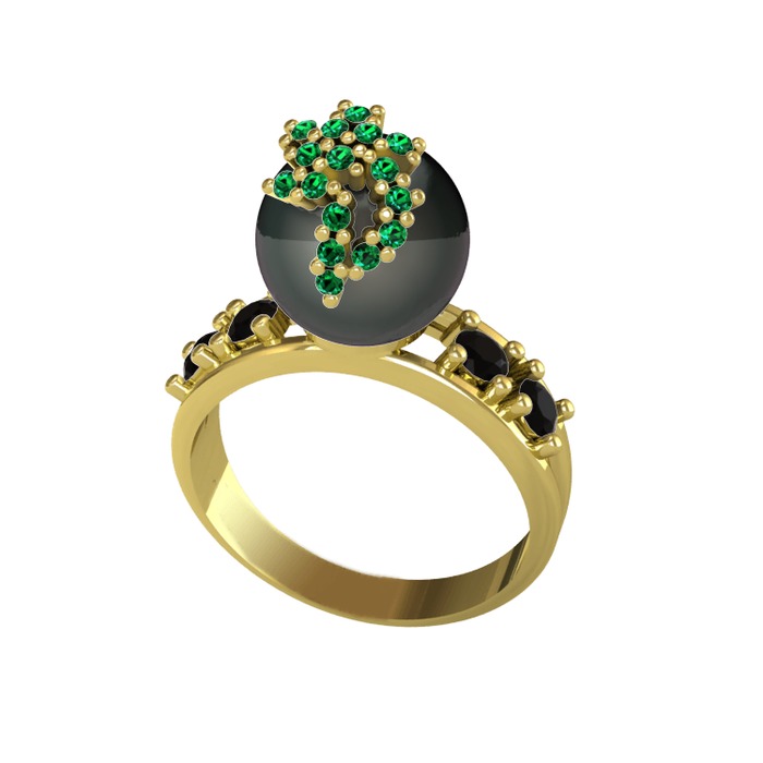 Siyah inci, yeşil kuvars ve siyah zirkon 14 ayar altın yüzük