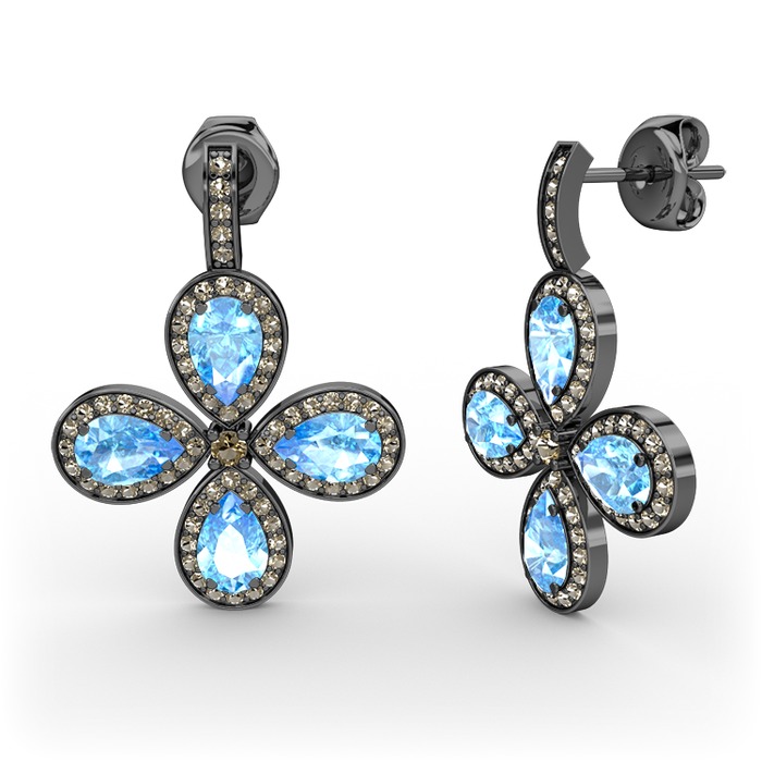Dumanlı kuvars ve akuamarin 925 ayar siyah rodyum kaplama gümüş küpe