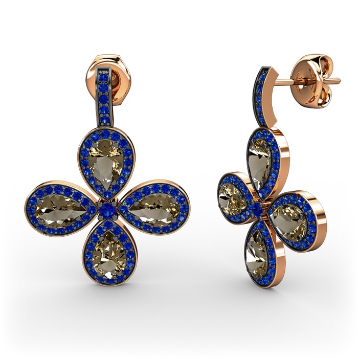 Lab safir ve dumanlı kuvars 14 ayar rose altın küpe