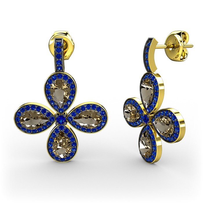 Lab safir ve dumanlı kuvars 8 ayar altın küpe