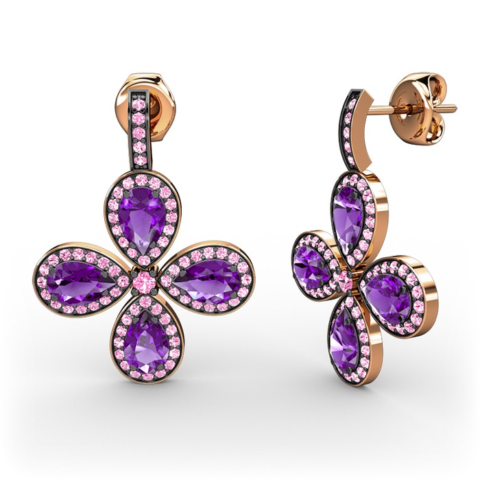 Pembe kuvars ve ametist 18 ayar rose altın küpe