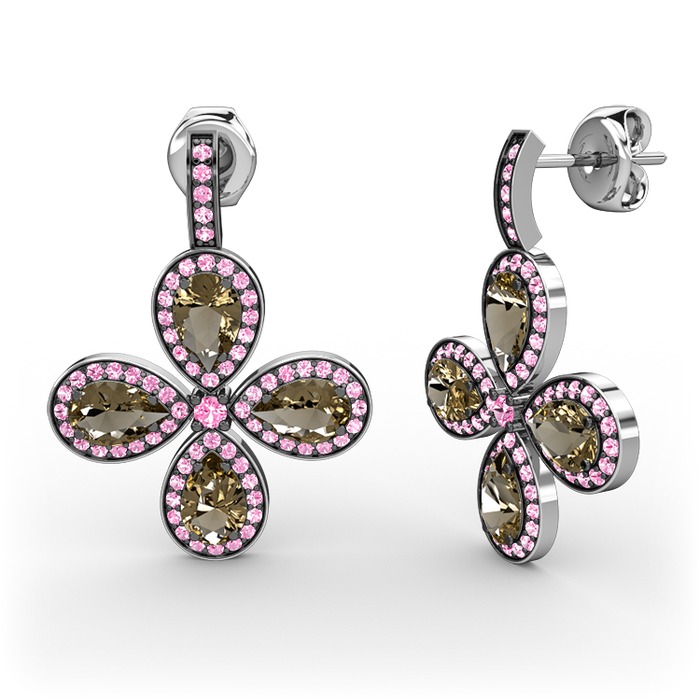 Pembe kuvars ve dumanlı kuvars 14 ayar beyaz altın küpe