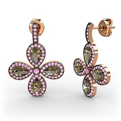 Pembe kuvars ve dumanlı kuvars 14 ayar rose altın küpe