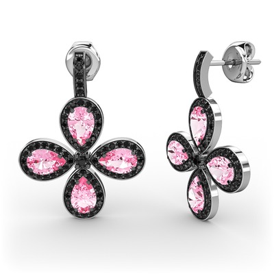 Siyah zirkon ve pembe kuvars 14 ayar beyaz altın küpe