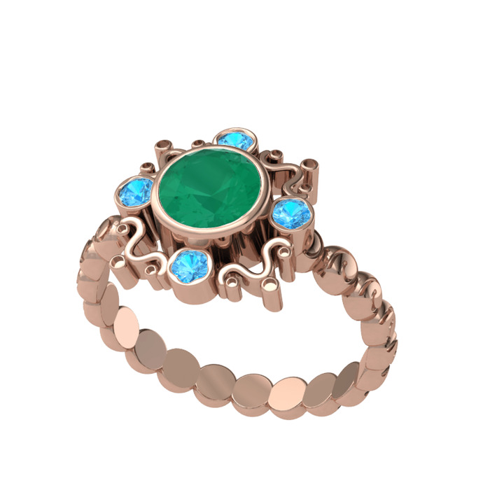 Kök zümrüt ve akuamarin 14 ayar rose altın yüzük