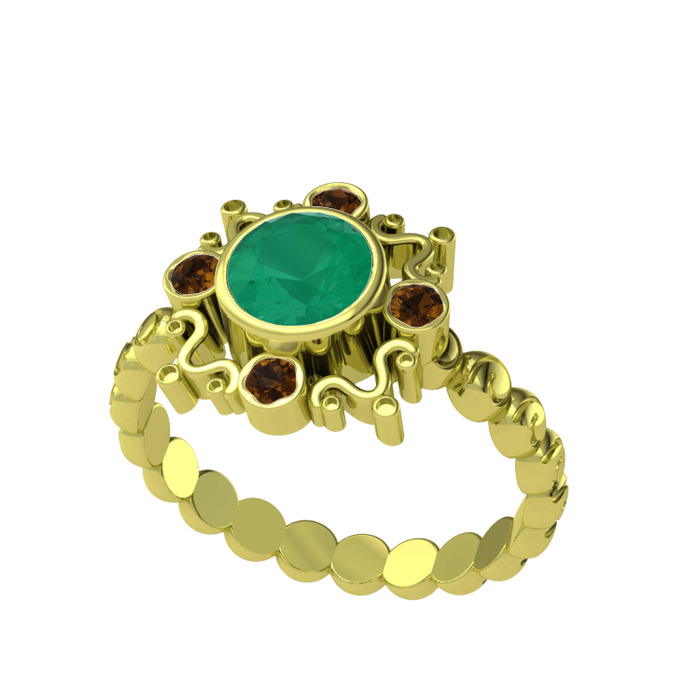 Kök zümrüt ve dumanlı kuvars 14 ayar altın yüzük