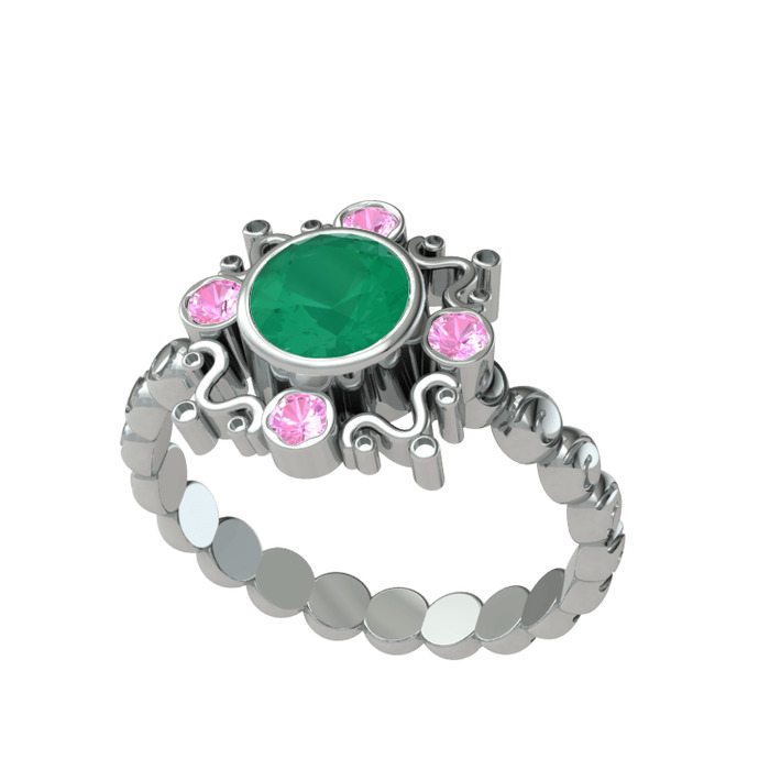 Kök zümrüt ve pembe kuvars 14 ayar beyaz altın yüzük