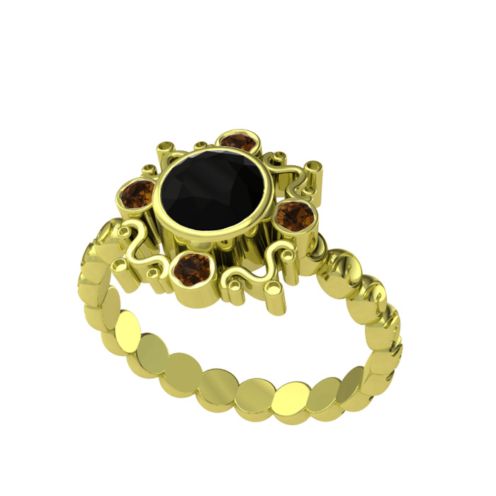 Siyah zirkon ve dumanlı kuvars 8 ayar altın yüzük