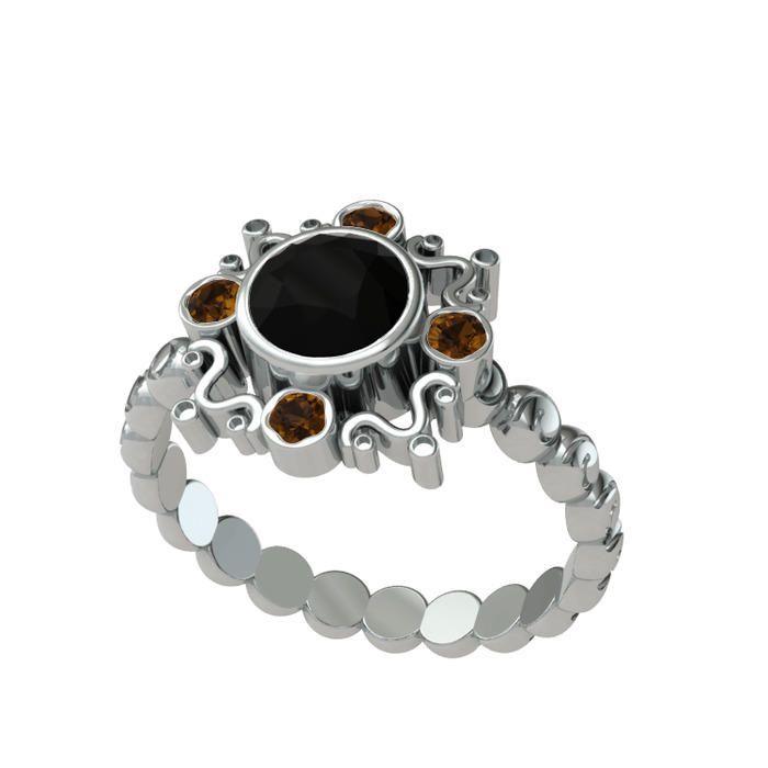 Siyah zirkon ve dumanlı kuvars 8 ayar beyaz altın yüzük