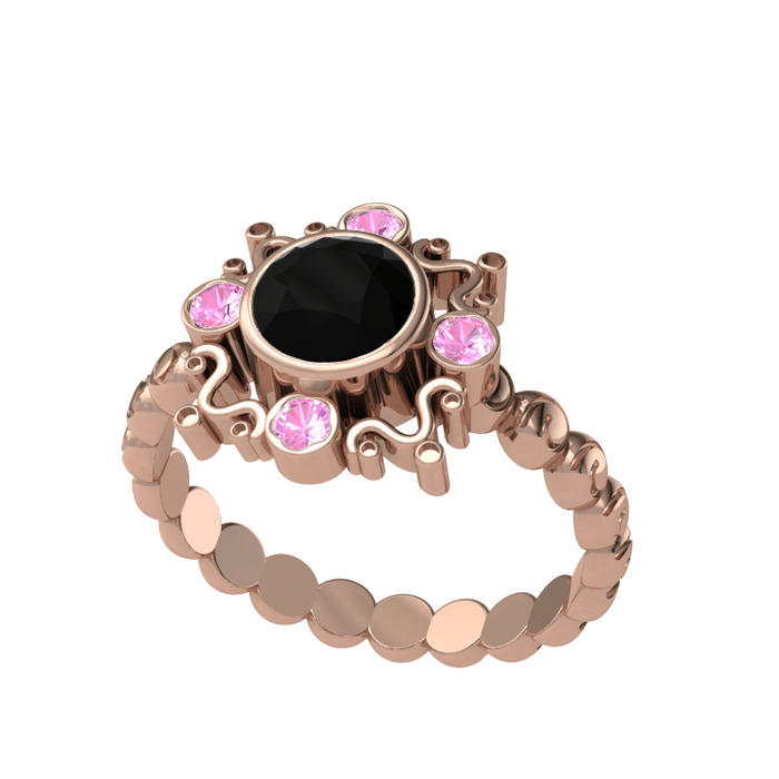 Siyah zirkon ve pembe kuvars 14 ayar rose altın yüzük