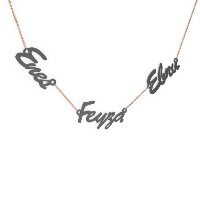 925 ayar siyah rodyum kaplama gümüş kolye (3 karakterli el yazısı, 40 cm rose altın rolo zincir)