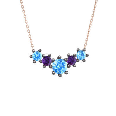 Akuamarin ve ametist 925 ayar siyah rodyum kaplama gümüş kolye (40 cm rose altın rolo zincir)