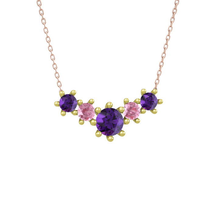 Ametist ve pembe kuvars 18 ayar altın kolye (40 cm rose altın rolo zincir)