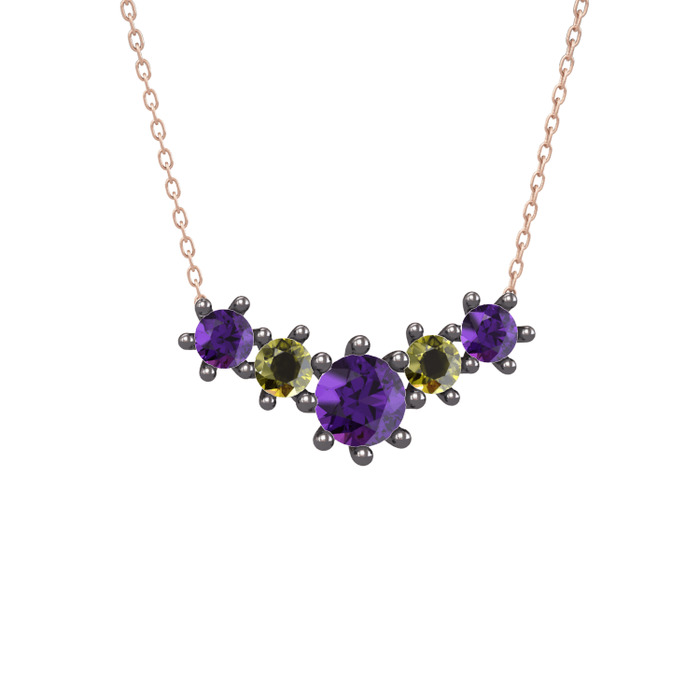 Ametist ve peridot 925 ayar siyah rodyum kaplama gümüş kolye (40 cm rose altın rolo zincir)
