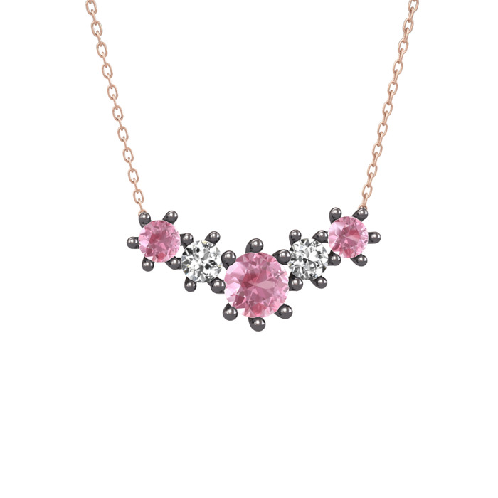 Pembe kuvars ve swarovski 925 ayar siyah rodyum kaplama gümüş kolye (40 cm rose altın rolo zincir)
