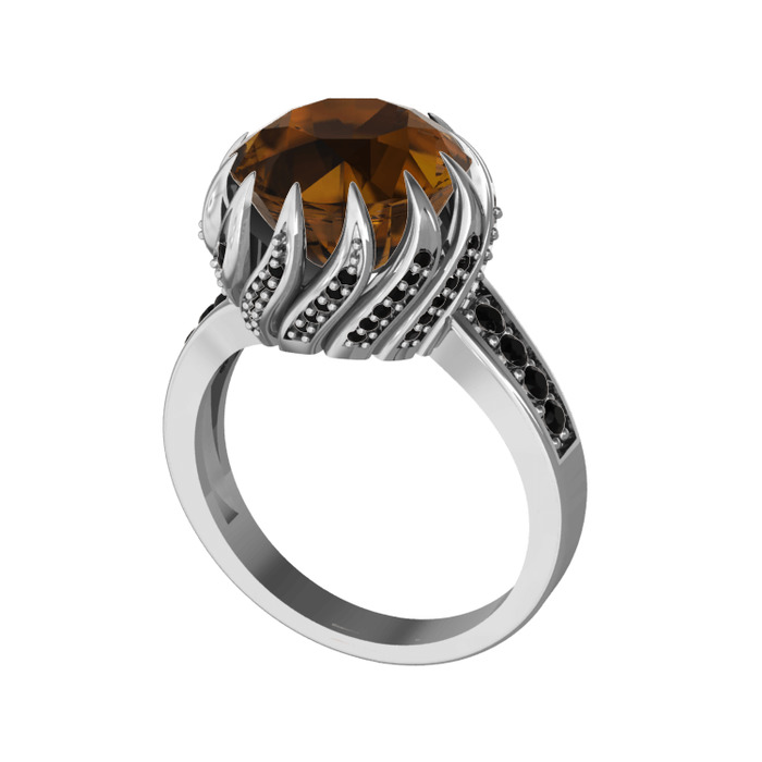 Dumanlı kuvars ve siyah zirkon 18 ayar beyaz altın yüzük
