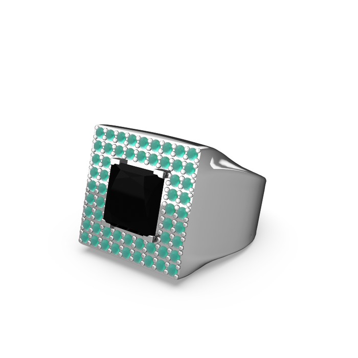 Siyah zirkon ve kök zümrüt 14 ayar beyaz altın yüzük
